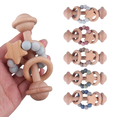 Am Azon vente chaude bébé anneau en bois hochet jouet de dentition perles de silicone sans BPA bébé mâcher anneau de dentition infantile jouet de dentition