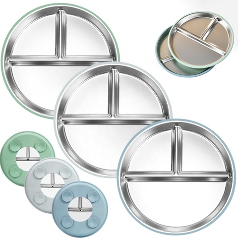 Atacado Food Grade 304 Aço Inoxidável Baby Feeding Plate Com Silicone Sucção Cup Strong Kids Stainless Steel Dining Plate